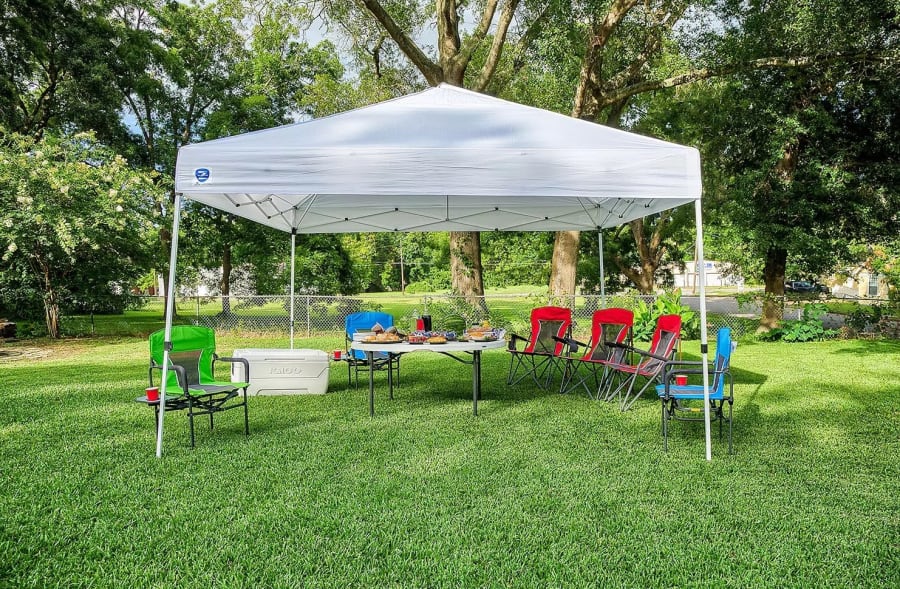 Instantly set up at parks, churches, and backyard parties using this 10'x10' pop-up tent. This tent will keep your guest cool and protected from the sun's harmful rays. This tent can easily fit (2) 6ft. tables and (12) chairs.